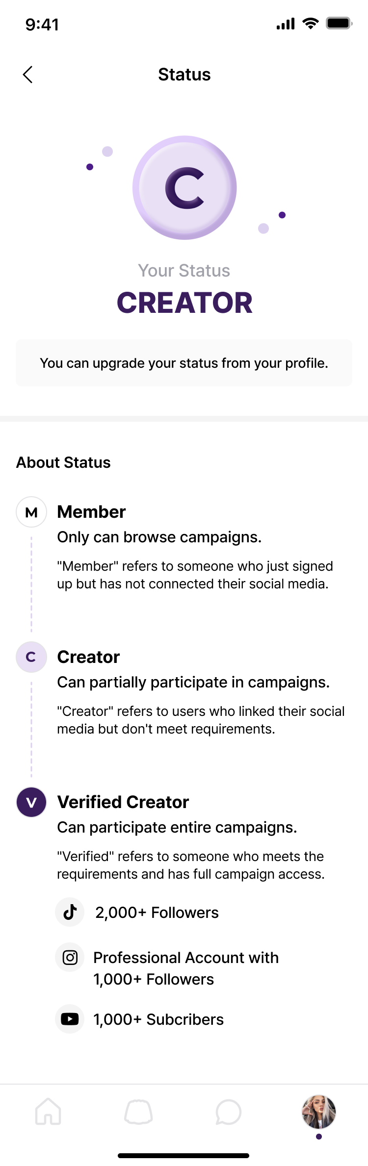 "Creator" refers to users who linked their social media but don't meet the requirements.
